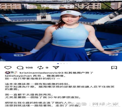 本周相信大家的关注点都在澳大利亚网球公开赛上,与此同时,中国台北网球选手詹咏然近日在个人社交媒体平台正式宣布退役,结束其长达三十年的职业网球生涯。