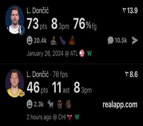有意思的是,两年前的今天,东契奇在击败老鹰的比赛里出战44分43秒,投篮33中25,三分13中8,罚球16中15,得到73分10篮板7助攻1抢断。
