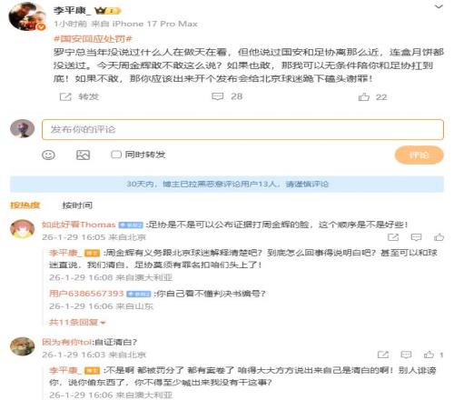 周四,在足协宣布对北京国安处以罚5分、罚款50万的处罚之后,北京国安在社交媒体“硬刚”。媒体人李平康则质疑道,“球迷最需要的肯定是事实真相,而不是虚无缥缈的口号!”