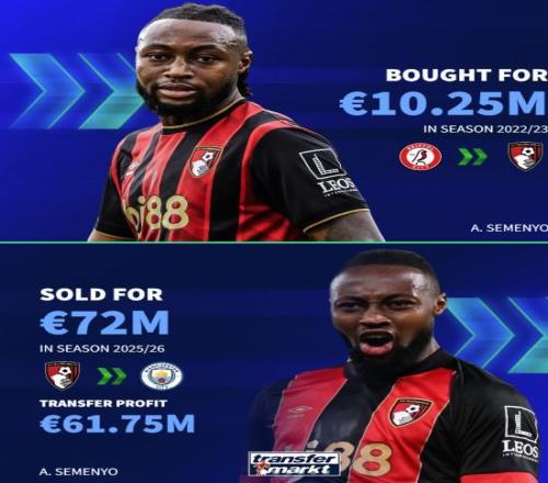 昨天,塞门约官宣加盟曼城。德转今天也列出了伯恩茅斯近年来几笔低买高卖的交易。塞门约22-23赛季 从布里斯托尔城买入 1025万欧25-26赛季 卖给曼城 7200万欧差价6175万欧索兰