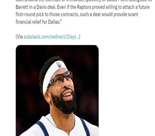 北京时间1月15日,ESPN的一档播客节目,Shams透露独行侠已经降低了对戴维斯的交易期待,独行侠已经决定不急于做出决定,因为戴维斯面临合同到期可以今夏再处理,也可以留下他等他伤病
